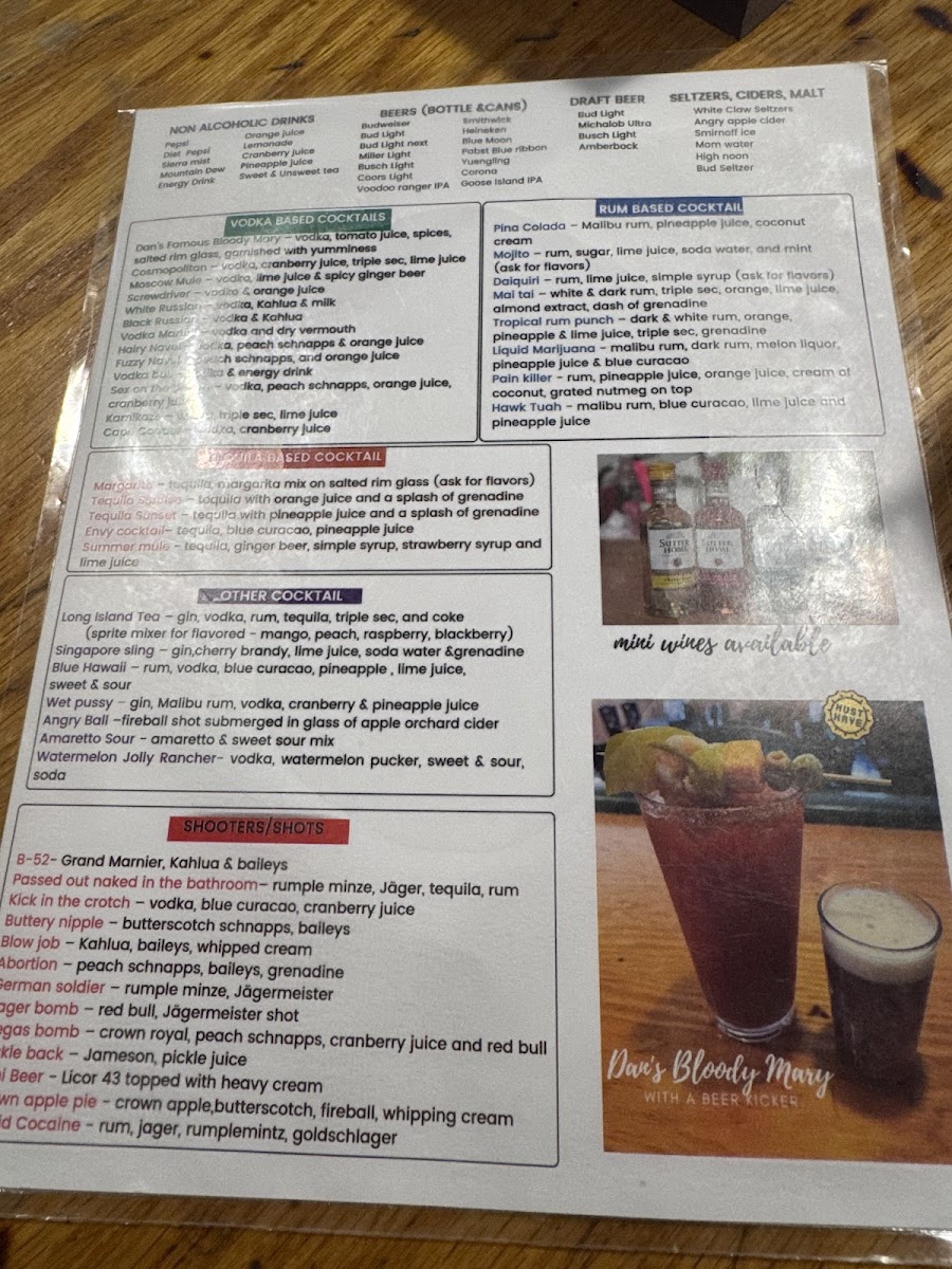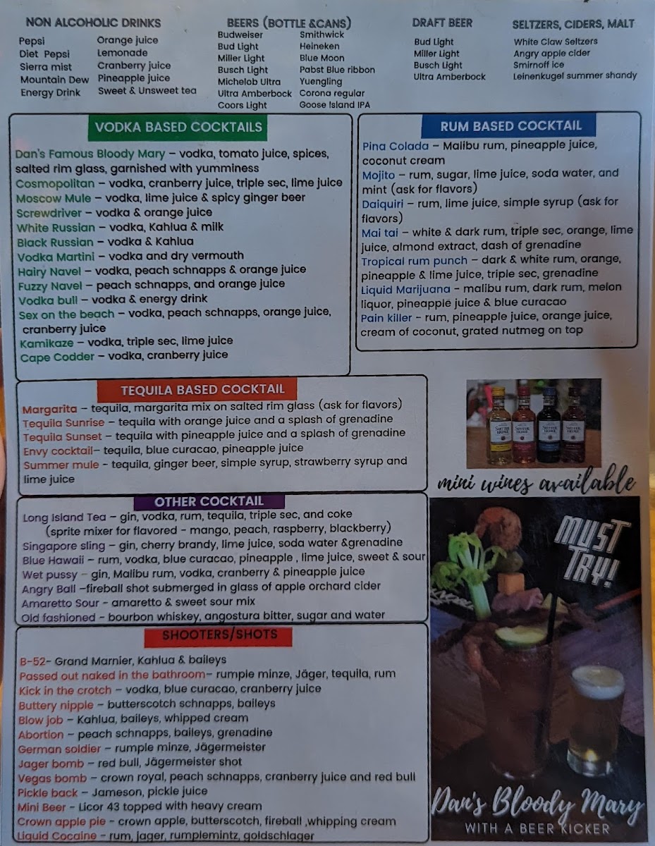 The menu offers a range of mouthwatering options that include classic sides like coleshaw, French fries, and house salad, amplifying your meal beautifully. Don't miss their renowned breaded pork tenderloin, celebrated for its home-breaded goodness, or indulge in unique dishes like the Filipino special, featuring succulent pork skewers and delicious lumpia, a testament to the owner's heritage. For those in search of liquid refreshment, their draft beers and creative vodka cocktails, including the famed Dan's Bloody Mary, are sure to elevate your evening.